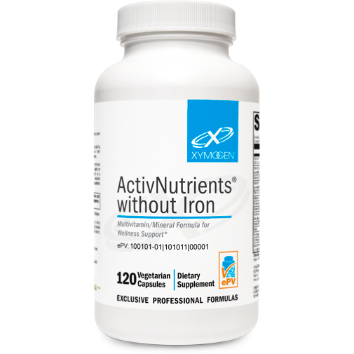 ActivNutrients® without Iron features a premium, multivitamin/mineral blend of high-quality vitamin and mineral forms selected for optimum utilization. The comprehensive nutrient profile is delivered in a vegetarian capsule and supports foundational wellness; provides antioxidant activity with vitamins C and E, selenium, and beta-carotene; and supports detoxification.*