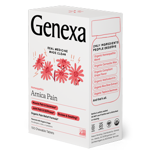 Genexa Arnica Pain is a real remedy, made clean – addressing muscle pain and soreness, joint pain and stiffness, and bruises and swelling*. Each chewable tablet has the same healing ingredients you need (organic homeopathic blend), but without the artificial ones you don’t (artificial dyes, common allergens, parabens). Founded by two dads on a mission to clean up the medicine aisle, Genexa only uses clean ingredients to make certified organic, gluten-free, non- GMO homeopathic medicines. It’s what people deserve.