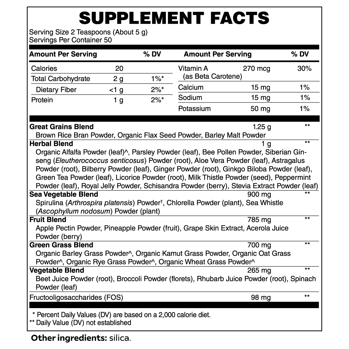 This whole-food blend empowers the body through fruits and vegetables, organic grasses, adaptogens, immune-boosting herbs, plant extracts, and enzymes.